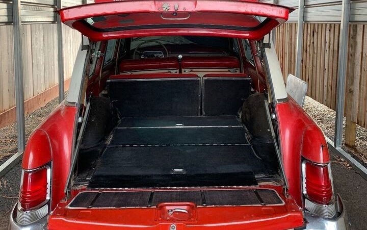 Surf’s up for the prospective new owner of this 1954 Mercury Monterey wagon, listed here on eBay. With a starting bid of $20,000 and no takers yet, this wagon is ready to go after many improvements. We’ll take a tour in a second but first a bit of history: Ford positioned and repositioned its Mercury brand name from its inception in 1938, initially situating it in the mid-price range, then twinning it with Lincoln to distinguish it as a premium product. The quest for differentiation never ends though, and in 1950, Ford added another slice to the Mercury line, using the Monterey name to connote a fancier trim level. Riding high on strong sales, Ford introduced its Y-block V8 in 1954, replacing the aging flathead. Meanwhile, the age of real woody wagons was ending, as customers found maintenance too onerous (anyone know the year, make, and model of the last woody wagon made in the US?) and manufacturers eschewed the expense of making the bodies. Ford dished up a solution, though – “ash wood” fiberglass trim surrounding a plastic “mahogany” decal. This Siren Red example comes complete with a modern surf rack. You can drive it home from Paradise, California.