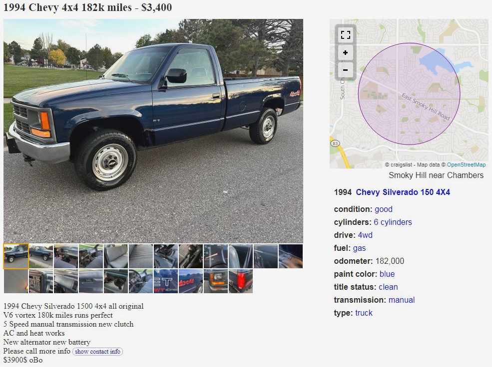 Believe it or not, this 1994 Chevrolet W/T 1500 4×4 5-speed pickup is only the second 1994 Chevy pickup we’ve seen here on Barn Finds, and the last one was back in 2019. I can’t imagine a nicer truck for the seller’s $3,400 asking price, especially one with 4WD, a 5-speed manual, and cold AC. They have it posted here on craigslist just southeast of Denver, Colorado. Here is the original listing, and thanks to Mike F. for the tip!