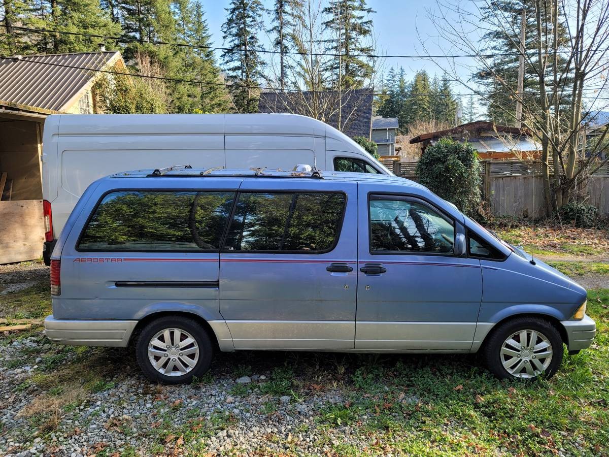 We had a high-end Aerostar: long wheelbase, 4.0, all wheel drive, styled wheels and white letter tires, a “conversion van”. Which meant aftermarket interior and a three-tone silver/gray/black paint scheme. It was really sharp. And it served our family well.