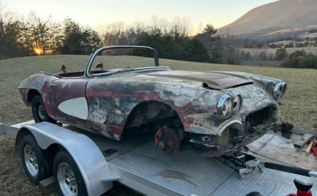 According to the seller, the frame has been “done,” but the fiberglass body will need some attention. We’re told the doors are “wrong” (not ’61 doors?), and there is no top or deck lid (though we see one in the photos). As such, this is a DIY project, and the seller suggests it could be a good candidate to set up for vintage racing. Total Corvette production for the model year was just under 11,000 units.