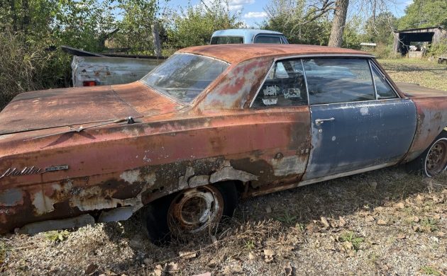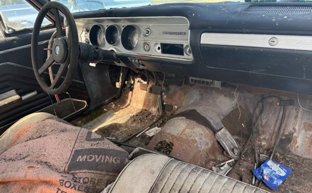 The steering wheel looks like it’s out of an ’80’s GM vehicle. It has the rubber coated horn button on it. It will also need a new right side (and if I guess, left as well) rear quarter panel. The rust looks like just fixing that would be a monumental task. I think that only someone that is a diehard and obsessive lover of this year Chevelle would want to try to salvage it. Should pick whatever you can from its bones and call the scrapyard for the rest.