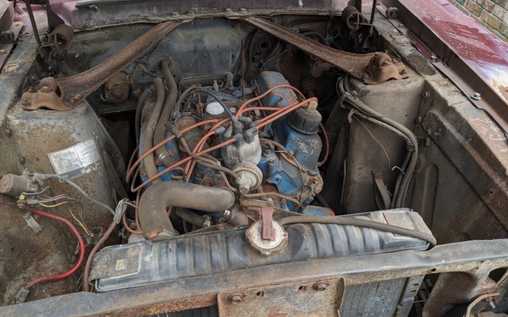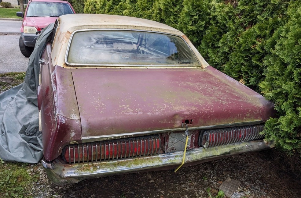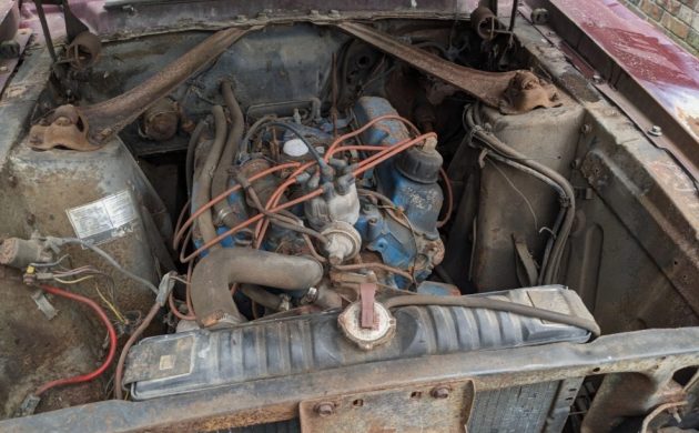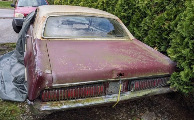 All cars have a story, and we’re sure this one does, too. But the seller may not know what it is. The motor does turn by hand, though some mechanical issue likely sidelined it some time ago. An attempt may have been made to keep it covered, but those efforts could have been stopped in recent years. The Merc has some rust, which is described as “better than some”. The burgundy paint is well past its prime, as is the contrasting white top.