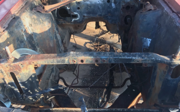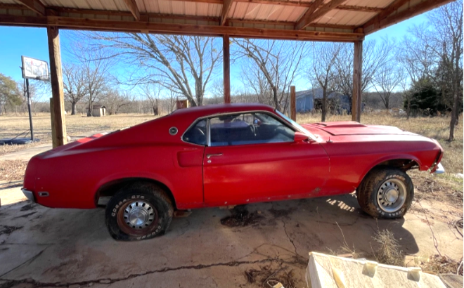 This red Mach 1 resides under what’s left of a barn (at least that’s what it looks like it was). But there are no sides to it, and it seems like an Oklahoma twister could easily finish it off. The Ford had an automatic transmission, which was sitting off by itself in the dirt. The car is surprisingly said to be mostly complete, sans the rear window glass. The front clip has not been secured in place, so some adjustments may be needed to load it onto a trailer. The 351 V8 has long since taken flight, but a spare 351 is available if the buyer wants it.