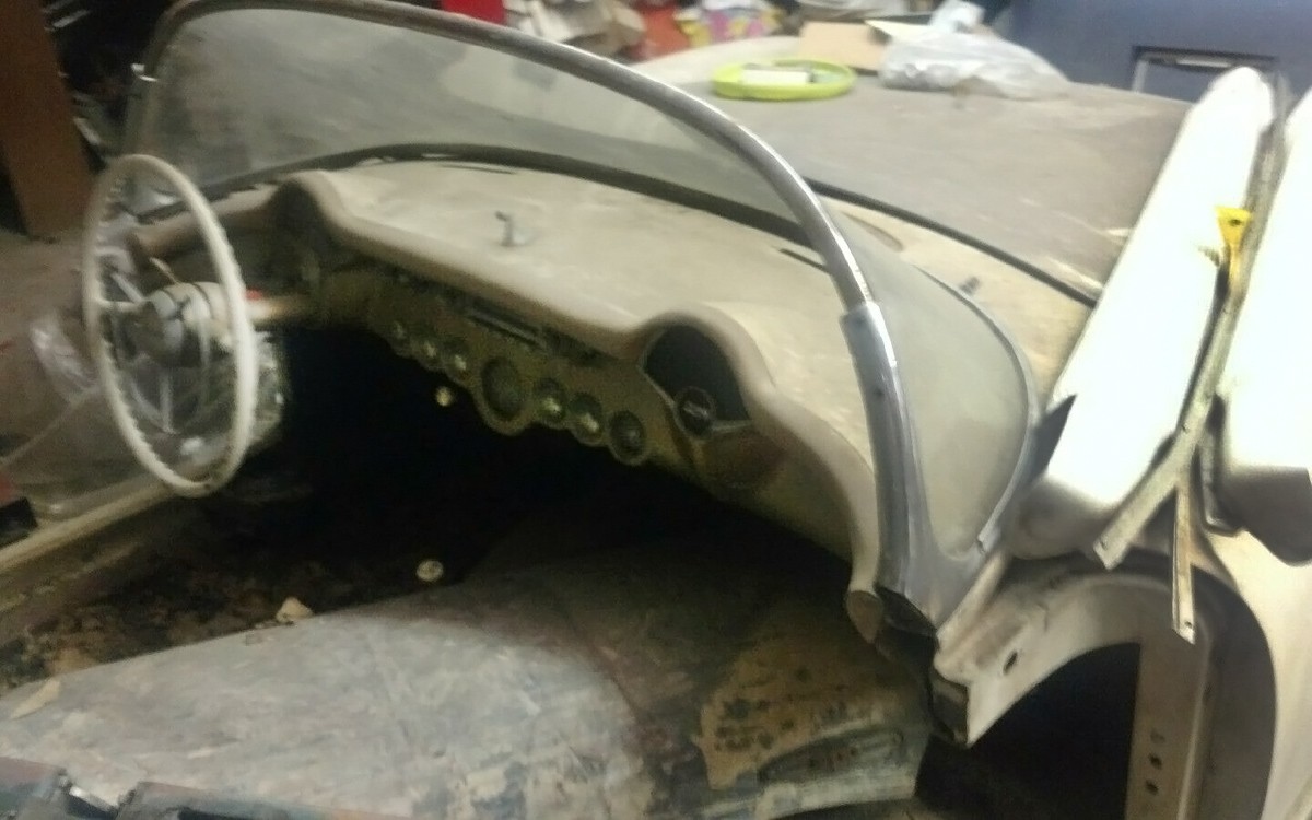 This is it for interior photos and as you can see, it’ll need everything here, too. The Pennant Blue cars had a tan or beige interior and top compared to a red interior for the white, black, and red cars in 1954. All of the 1953 cars were Polo White with a red interior and there were only 300 of those so if you can find one of those, grab it. The ’53 and ’54 Corvettes all came with GM’s 2-speed slip-and-slide (as we called them) transmission, the PowerGlide.