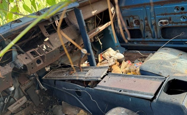 Many of the interior parts have been pilfered, including most of the dash items and gauges, along with the steering column and wheel. The headliner and door panels are also missing, at least on the passenger side, but the seats are all present. Perhaps the springs and metal are strong enough that the seats can be salvaged and recovered, but if not, it shouldn’t be too difficult to source some different components. There’s no mention of how long ago this one was stripped and left for dead, but from the looks of things, I’m going to guess a decade or more.