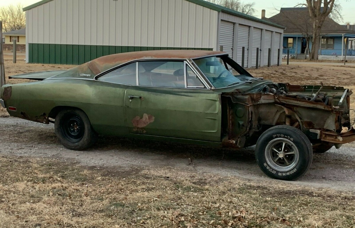Let’s see, a base Charger that took a hard hit to the front (hood had to be cut out to get open for parts removal), lo-spec (cheap) seat recovering, non-running “***383 VIN MATCHING BLOCK*** PRETTY SURE ENGINE FROZE UP”, top of roof at the left corner of the rear window is rusted through, holding broadcast sheet hostage unless you opt for buy it now….a total turn off ad! Finding a replacement front clip is going to be pricey, along with the required frame work. $17.5K BIN? GLWTA!!