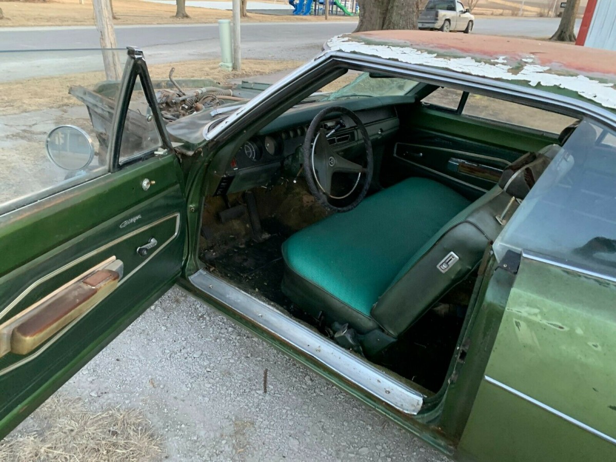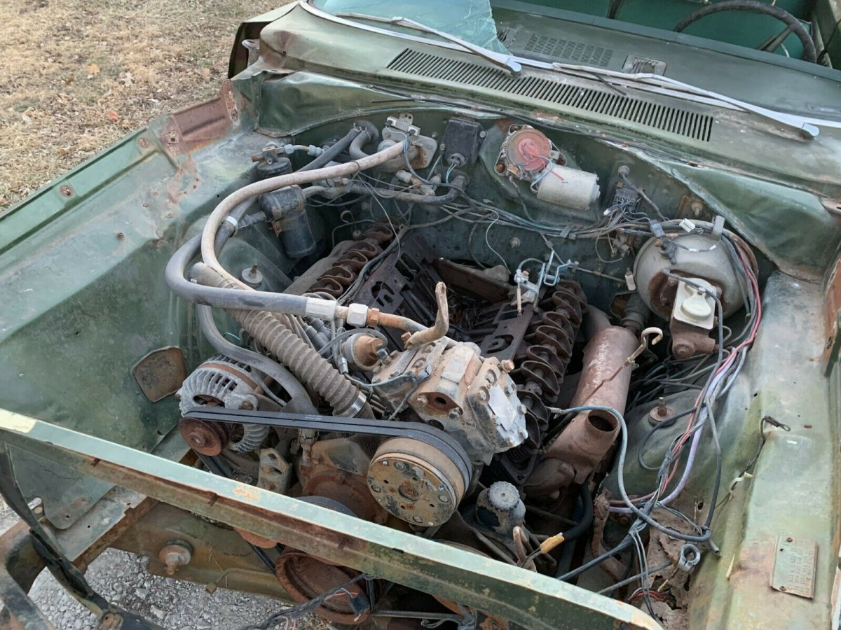 This ’70 Charger got itself into an accident in 1979 and hasn’t been touched, except for the removal of the front clip and pulling parts off the motor. All that sheet metal and the car’s front rails and aprons are bent. And the trunk floor has some rust, but we’re told the rest of the “bones” are good. The dark green paint was offset at one time by a vinyl top which has long ago been peeled away with patina remaining. Inside the car, the door panels at a minimum will need some work, yet the front seat appears to have been recently reupholstered.