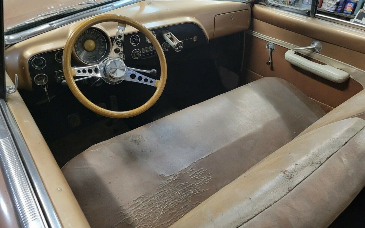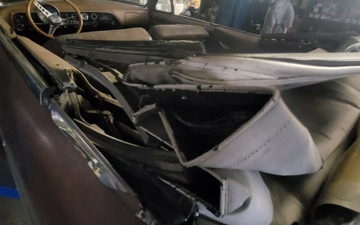 The appearance of this convertible is pretty standard fare for the era, some of the badging has been removed (shaved?) and the grill has been altered with a custom horizontal bar. Beyond that, it’s pretty standard-looking. The probably not original finish is pretty faded but the body at least looks straight and mostly complete. The seller advises, “Some lower rust. Floors good. Frame is good“. The convertible top, sans rear window, is looking shaky but the scissor frame folds, and though power-operated, it is currently relegated to manual operation. It is claimed that this Ford has been sitting stored for decades and it looks like it judging from the dust. Regardless of top condition, it’s too bad it wasn’t parked with it in the up position, it’s easier on the interior that way.