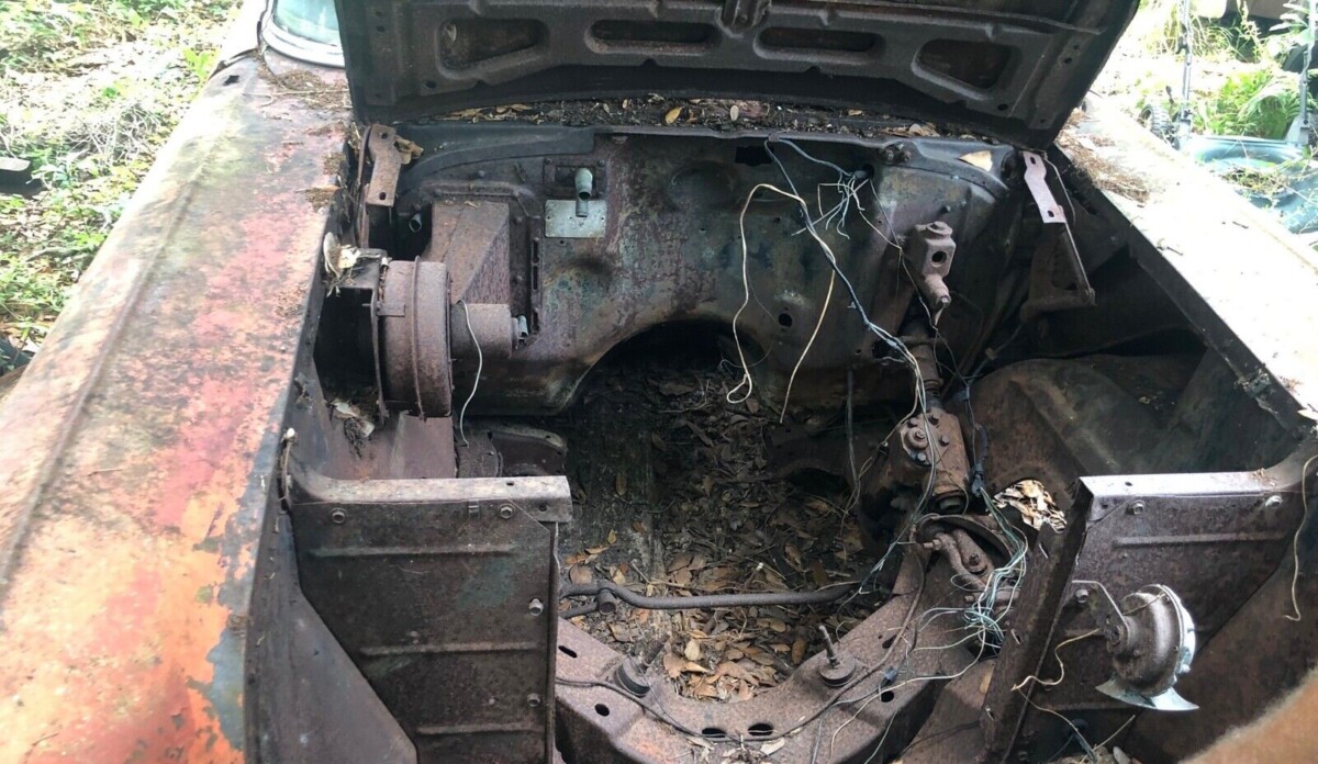From what we can ascertain, the seller found this car in a yard or field a couple of years ago and brought it home to his/her garage. But nothing seems to have transpired with the car since then. We’re told that some of the parts that are not visible are residing in the trunk, but others will likely need to be sourced. The passenger side rear quarter panel is seriously dented, and we’re told one area of the floor pans will need to be replaced.
