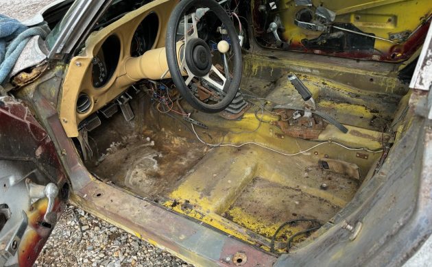 The interior is a case of “what you see is what you get.” Most of the dash is intact, as are the gauges, steering column, and the AM/FM radio. The saddle upholstery and seat frames are long gone, adding to a long shopping list if the winning bidder follows the restoration path. The first owner didn’t load it with options, although they did equip the car with air conditioning. The engine bay houses a 350ci V8, bolted to a four-speed manual transmission. The seller admits they know nothing about the car’s mechanical condition beyond the fact that it rolls and steers. As with the rest of the car, it raises more questions than it answers. However, if the engine turns freely, it might be worth rebuilding as part of a project build.