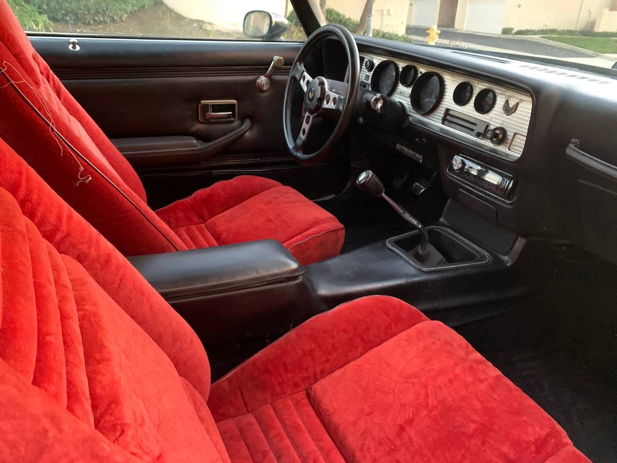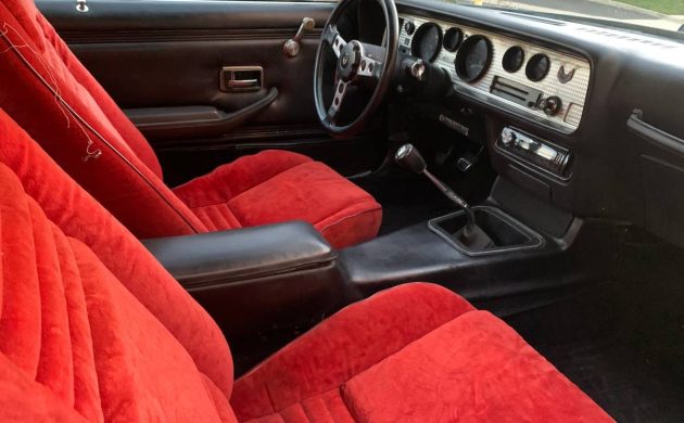 The deluxe black interior looks to be in nice driver’s condition. Interestingly, the seats are covered in red cloth material instead of black to match the rest of the car. As can be seen, the car has the upgraded door panels which came with the deluxe interior but the car does not have power windows, T-Tops or air conditioning. An aftermarket radio resides installed in the dash and the seller states that the dash has no cracks.